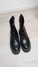 Stivaletti alla caviglia con un design unico. - Effetto coccodrillo. - Dettagli con perle lungo la suola. - Chiusura con lacci e zip laterale.