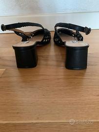 Scarpe eleganti a punta chiusa, modello slingback con cinturino regolabile alla caviglia. Realizzate in materiale intrecciato nero, con sottopiede in vera pelle e tacco medio comodo e stabile.