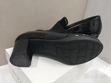 Calzatura linea confort in vernice nera con fascia elastica, rigorosamente Made in Italy. Tacco cm. 5,5 mai indossata. Tg. 38.
