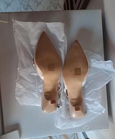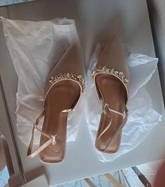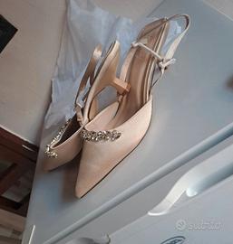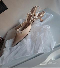 Vendo scarpe da donna eleganti, in raso, color champagne, con pietre color argento e tacchetto. Vestibilità comoda, nuovissime come in foto, mai indossate, le vendo perchè non ho potuto fare il reso e sotto l'abito del matrimonio non stava bene questo colore di scarpe. Comprate su internet. Taglia 41. Per informazioni, contattami in chat ☺️👠👜🛍