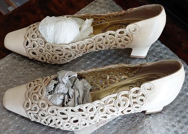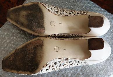 Vendo in condizioni ottime, poco utilizzate, delle scarpe color crema per donna molto eleganti, della prestigiosa maison René Caovilla. Tacco basso. Taglia riportata sulla suola "8", ritengo US, equivalente ad un 38,5-39 europeo. Si tenga presente, però, che mia madre, proprietaria delle scarpe, normalmente veste, a seconda della scarpa, o un 38 o un 39 e che la lunghezza del piede è di 25,5 cm circa. Quindi si prega di considerare questa circostanza ai fini della taglia. Si spedisce senza scatola originale. Prezzo non trattabile.