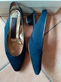 Scarpe décolleté La Nouvelle n. 36,5 in tessuto crepe blu, con suola in vero cuoio. Modello chanel con punta affusolata e parte posteriore del piede scoperta. Molto comode.