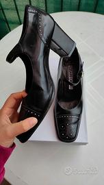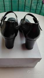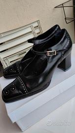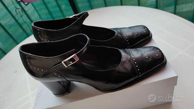 Questo paio di décolleté vintage firmate Cesare Catini (taglia 40) incarna uno stile sofisticato e bon-ton, tipico della manifattura italiana di alta qualità. La tomaia è realizzata in vero cuoio nero con una finitura opaca, arricchita da un raffinato dettaglio sulla punta: un inserto in vernice lucida con un delicato fiocco piatto, che crea un elegante gioco di texture. La struttura presenta una punta sfilata ma non eccessivamente stretta e un tacco a rocchetto di media altezza, rivestito in pelle, che offre il giusto compromesso tra slancio e stabilità per un uso prolungato. L'interno, completamente foderato in pelle color cuoio, e la suola in vero cuoio testimoniano l'attenzione ai materiali naturali e alla traspirabilità, rendendola una scarpa ideale per contesti formali o professionali che richiedono un look curato e senza tempo.