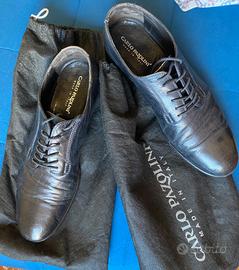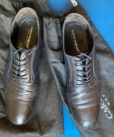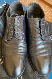 Scarpe eleganti, vero cuoio, colore blue scuro, taglia 42. Discrete condizioni, utilizzate ma ben tenute e presentano normali segni di usura. Dotate di sacche per custodia.