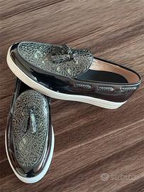 Scarpe da uomo eleganti taglia 42, nuove mai indossate. Design moderno con tomaia lucida nera e dettagli geometrici raffinati sul davanti.