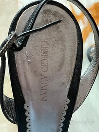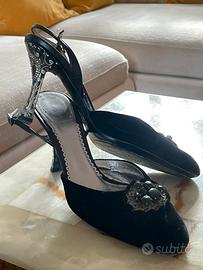 Scarpe in velluto nero, eleganti e particolari, con inserti in strass e pietre. Giorgio Armani.