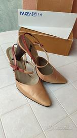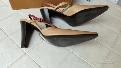 scarpa molto elegante e raffinata, anche da cerimonia, n.40 per piede affusolato, tacco comodo alto 9-10 cm, colore oro e cinturino oro e bordeaux. usata 1 sola volta. nessun difetto nè segni di usura, solo una piccolo graffio su una punta.