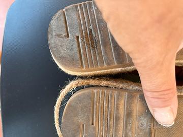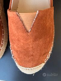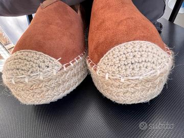 Comodissime Scarpe donna Espadrillas color cuoio scuro numero 40 indossate due vokte praticamente nuove. La suola della acarpa sinistra e un po piu corta ma non si vede e sopratutto non incide sulla clzata e camminata( vedi ultima foro)