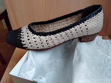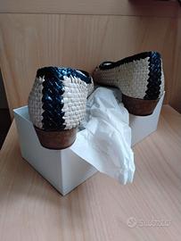 scarpe estive decolté chiuse in materiale tipo rafia colore beige e blu, tacco cm.3, molto comode, pianta larga. Vendo per inutilizzo, usate pochissimo.