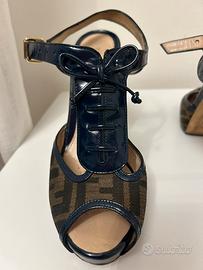 Scarpe Fendi Originali 100% Pagate 600 euro Tacco 12 in legno Cinturino pelle verniciata blu Monogramma Taglia 39