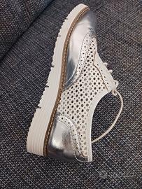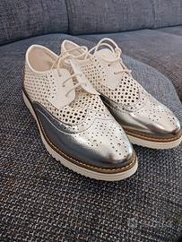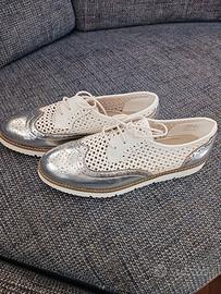 scarpe donna francesine con lacci traforate, bianco e argento. Nuove mai usate per cambio taglia.