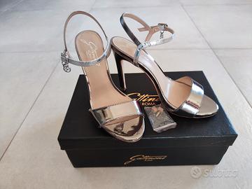 Vendo scarpe Gattinoni n°37 argento. Scatola originale con tacchi sostitutivi originali. Usura della suola nei limiti del loro utilizzo (usate 2-3 volte in occasione di ricevimenti). Cinturino con elastico integro.