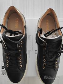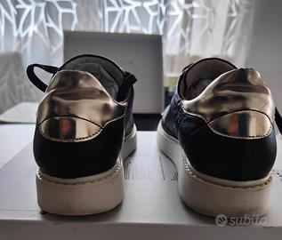 Eleganti scarpe Geox da donna, numero 38. - Tomaia in pelle nera. - Dettagli dorati sul tallone e sui lacci. - Suola in gomma bianca.