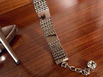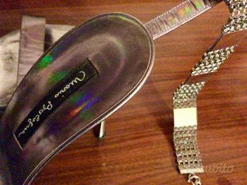 Meravigliosi sandali gioiello “Mario Bologna”. Elegantissimi, possono valorizzare al meglio la femminilità di ogni donna. Adatti sia per una cerimonia che per eventi importanti. Tacco 12 con leggero plateau. Color argento iridescente e fermati alla caviglia da una scintillante sequenza di strass, ovviamente regolabile. Indossati in due sole occasioni, quindi praticamente perfetti. Misura 37