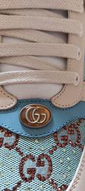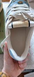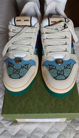 Come da foto, vendo sneaker Gucci modello Screener. Sono quelle con il tessuto canvas monogram azzurro/verde e la suola in gomma verde. Le scarpe nascono già con l'effetto vintage/vissuto tipico di questo modello (lacci e pelle leggermente scuriti di fabbrica), quindi sono molto facili da portare senza l’ansia di sporcarle. Taglia: 41 Usate pochissimo / Pari al nuovo Accessori: Ho ancora la loro scatola originale verde visibile in foto.