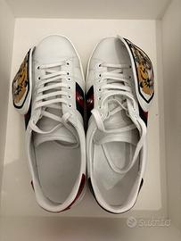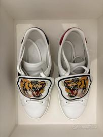 Vendo sneakers Gucci in pelle, con inserti classici blu/rosso sul tallone, doppia patch tigre ricamata, complete di dust bags e scatola originale, misura EU 26,5cm (il mio numero solito è 42), usate una manciata di volte, nessuna imperfezione, perfette ed originali in tutto.