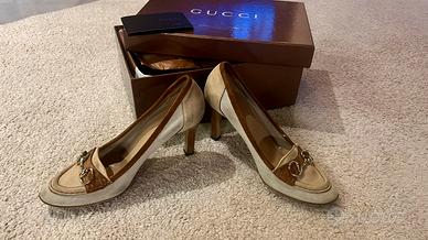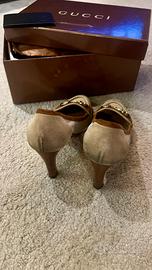 Scarpe decollete Gucci originali, in camoscio beige chiaro, tacco 7 cm. Ottime condizioni, complete di scatola. Disponibile per spedizione.