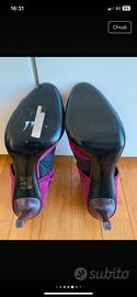 Scarpe- sandali Gucci in pelle scamosciata morbidissima color fucsia e dettagli in metallo dorato.,chiusura alla caviglia tramite fascette in pelle e laccetti in raso., altezza tacco 10 cm., numero 37., Sottolineo che manca un piccolo ciondolino in un laccetto per il resto sono davvero nuovissimi!!!!!