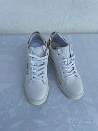 Scarpe sneakers marca Guess colore bianco con dettagli oro, numero 39, plateau alto circa 7cm sul tacco; lievi difetti visibili nelle foto, indossate poche volte. Pagate 135€, nel complesso condizioni ottime.