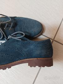 Scarpe Gutteridge originali taglia 43 modello derby brogue in vera pelle scamosciata blu con suola in gomma e lavorazione traforata classica. Presenza di un piccolo distacco superficiale della suola in entrambe le scarpe ma non compromette l'uso è solo un difetto di estetica (vedi foto).