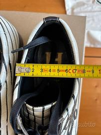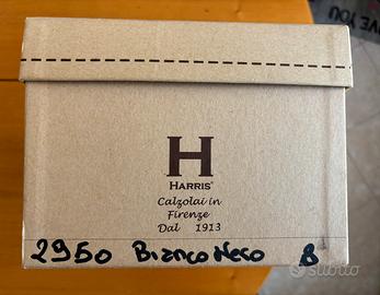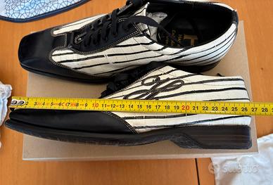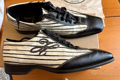 Originali primi anni 2000, esemplare unico (campionario) in pelle bianco (panna) nero, indossate pochissime volte e conservate con cura nella loro scatola; le suole sono integre ma la gomma potrebbe essere soggetta al naturale fenomeno dell’invecchiamento. Vestono slim