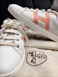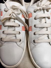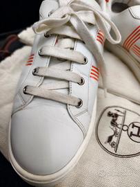 Eleganti scarpe Hermes usate pochissimo. - Design moderno con dettagli a righe. - Tomaia in pelle bianca. - Inserti color arancio sul tallone.