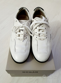 Scarpe mod. sneaker donna HOGAN, originali, usate poco e tenute bene. Sono in pelle bianca con inserti neri, n.36 calzabilità molto grande, per un numero 37-37.5 regolare. Lacci appena sostituiti con nuovi originali.