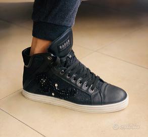 Scarpe Hogan Rebel alte in pelle nera e tessuto glitterato, con dettagli eleganti in rilievo e decorazioni di pietre nere e brillanti sul lato. Modello casual-chic perfetto per abbinamenti versatili, con logo visibile sulla linguetta.