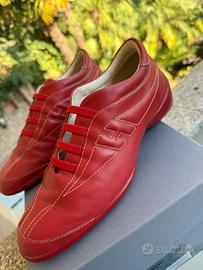 Sneaker in pelle dal design moderno e raffinato. Colore Rosso intenso, con cuciture bianche a contrasto che ne esaltano le linee. Fasce elastiche rosse sul dorso, al posto dei tradizionali lacci, per una calzata comoda e veloce. Logo “H” ben visibile sul lato esterno. Usate 1 sola volta.
