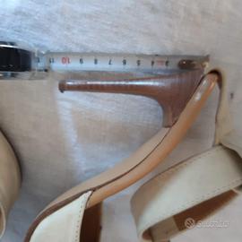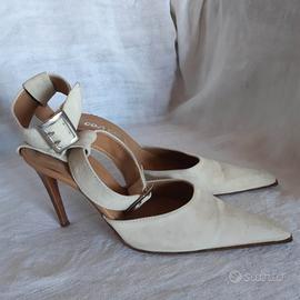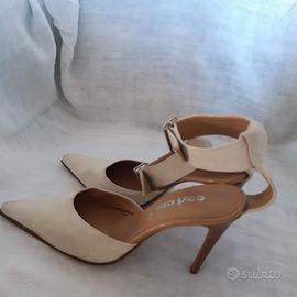 Bellissime scarpe in camoscio per donna. color panna, chiusura con cavigliera con fibbia, tacco a spillo cm.10 , molto eleganti e femminili, usate poco, ottimo stato.