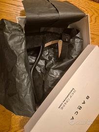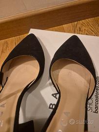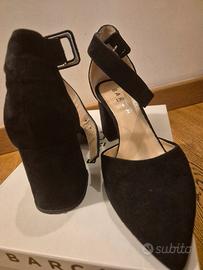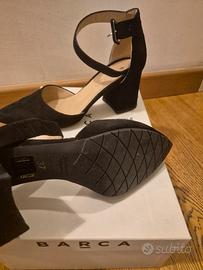 Scarpe da donna n. 37 marchio Barca, con cinturino alla caviglia e fibbia quadrata. Camoscio nero, in perfetto stato perché utilizzate molto poco. Suola in gomma antiscivolo. Comode, con tacco largo e stabile, sono adatte sia per occasioni eleganti, sia per un utilizzo quotidiano con un tocco ricercato. Fornite con scatola e incarto originale.