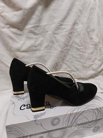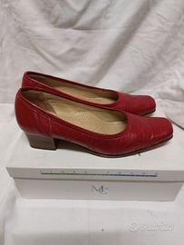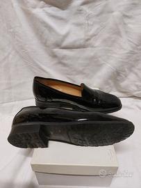 scarpe in pelle n.36: sandali TODS chanel color cuoio, TOSCA marrone, vernice nera DUE LEONI, decoltè nere con inserto tacco oro, decoltè blu, decoltè rosso.