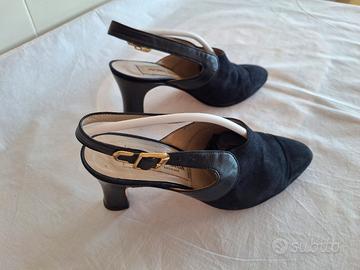 scarpe n. 35 in pelle/velluto rasato colore blu profondo tacco alto 6 cm, made in Italy