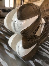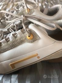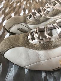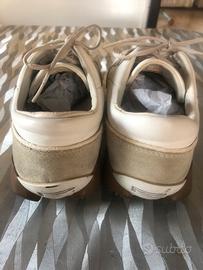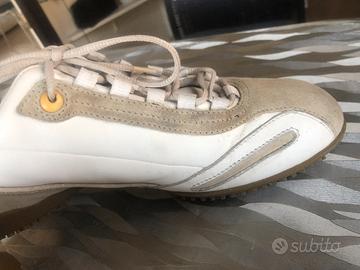 Scarpe in pelle morbida bianca con logo PIRELLI giallo e scamosciato grigio, usate un paio di volte.