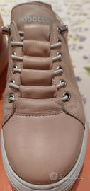 Comodissime scarpe da ginnastica in pelle, "Podoline" predisposte per accogliere plantari ma indossabili e confortevoli anche con il suo plantare originale. Color crema, scarpe dall'aspetto giovanile, con lacci elasticizzati di facile vestibilità.