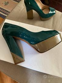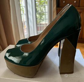 Bel paio di scarpe Lucci in pelle lucida peep-toe. Tacco cm 13 bicolore petrolio/cognac compensate davanti cm 3, laterale cm 4 color cognac. Di grande vestibilità. Ottimo stato, usate 1/2 volte. Taglia 39.