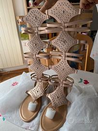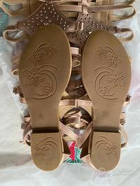 Sandali dorati in stile spartano, perfetti per un look estivo.