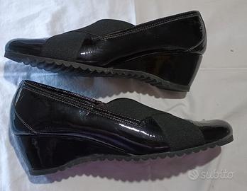 Scarpe Katrin donna décolleté in pelle nera verniciata, tacco mezza zeppa alto cm 5 , hanno fascia elastica per ottima aderenza e per facilitarne la calzata. usate una sola volta per sbagliata misura , la persona indossa 39,5/40