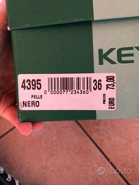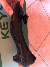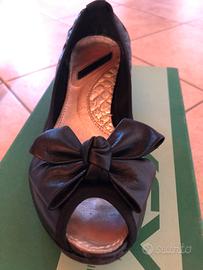 Scarpe in vera pelle, nere, tacco molto basso (circa 4 cm) quindi molto comode . Hanno l’open toe ( ovvero aperte sul pollice) . Messe si e no 5 volte, forse . Non perché non siano comode ma perché abituata a tacchi alti. Come si vede dalle suole che sono nuove . Taglia 36 italiana .