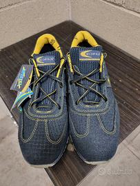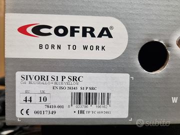 Scarpa estiva antinfortunistica S1 P SRC, marca Cofra, modello Sivori, linea Running, misura 44, colore blu scuro/giallo. Tomaia in pelle scamosciata forata e tessuto BREATEX con tessitura 3D, altamente traspirante. Fodera interna SANY-DRY® 100% poliestere, tridimensionale, traspirante, assorbente e deassorbente, antiabrasione. Fodera esterna in tessuto BREATEX, altamente traspirante. Soletta FOOT-PAD, estremamente morbida e confortevole. Grazie al poliuretano a bassissima densità, si automodella, consentendo una corretta distribuzione del peso corporeo e conferendo un’immediata sensazione di comfort. L’elevato assorbimento dello shock d’impatto è ottenuto con un materiale altamente resiliente e una perfetta bombatura al centro del tacco. Puntale ALUMINIUM 200 J. Lamina non metallica APT PLUS - Zero Perforation. Suola in poliuretano/TPU con granuli in gomma riciclata. Calzata: 11 Mondopoint Scarpe nuove, vendo per acquisto numero errato.
