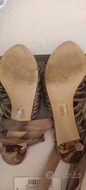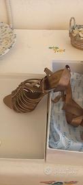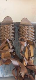 Scarpe con tacco dorato e stringhe in tessuto - tipo raso - modello alla schiava. Punte di ricambio.