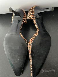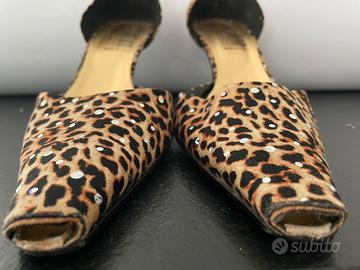 Eleganti scarpe con stampa leopardata e dettagli luminosi. - Modello con punta aperta. - Design con scollo laterale.. - Made in Italy. - Tacco alto - Praticamente mai usate - Misura 39