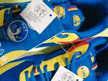Vendo le iconiche sneakers Lidl in colorazione blu, giallo e rosso, taglia EU 42 (UK 8). Si tratta del modello dell'edizione limitata del 2021, molto ricercata e apprezzata dai fan!