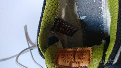 - scarponcino della AKU tenuto bene, goretex, suola in Vibram, scamosciato grigio con inserti verde mela
