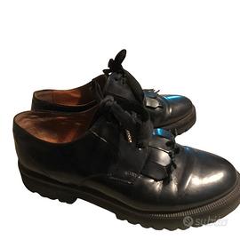 Caratteristiche: pelle nera lucida, suola antiscivolo, chiusura stringata, stile heritage, fodera in pelle, calzata regolare. Lunghezza suola esterna visibile in foto. Perfette per look urban chic o eleganti.