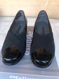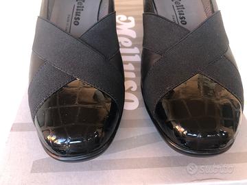 Scarpa Melluso nera, in pelle ed elastico ad incrocio. Made in Italy. Mai utilizzata. Tacco 4 cm Prezzo trattabile.