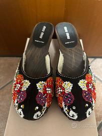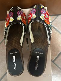 Zoccoli Miu Miu con shearling ricamato dei primi anni 2000 - Taglia 36 - Modello di ricamo floreale - Dettagli borchiati e scellino interno. - Hanno suole antiscivolo fin dal primo utilizzo. - Altezza tacchi: 5 cm - Questo articolo è usato ma in ottime condizioni, quasi nuovo