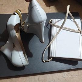 Scarpe bianche da donna ,eleganti, décolleté , decolte , originali Moa Master of arts , numero 37 ,5 , tacchi particolari alti 9 cm . Di vera pelle con le suole di cuoio . Borsa borsetta pochette di plastica dura lucida vintage dimensioni 14x20 cm