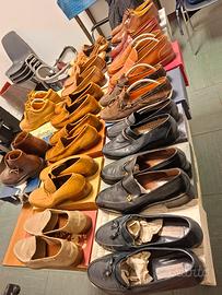 collezione di calzature da uomo, tra cui spiccano diversi modelli classici e artigianali. Sono visibili vari stili, dai mocassini alle scarpe stringate e sandali, realizzati prevalentemente in pelle e camoscio di diverse tonalità di marrone e