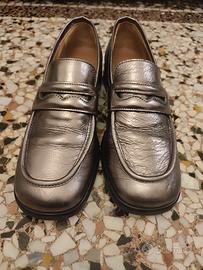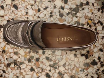 Mocassino in perfette condizioni, usato un paio di volte. Ottima pelle e rifiniture. Comprate da Tasselli a Genova. Colere argentato tendente al rosa.